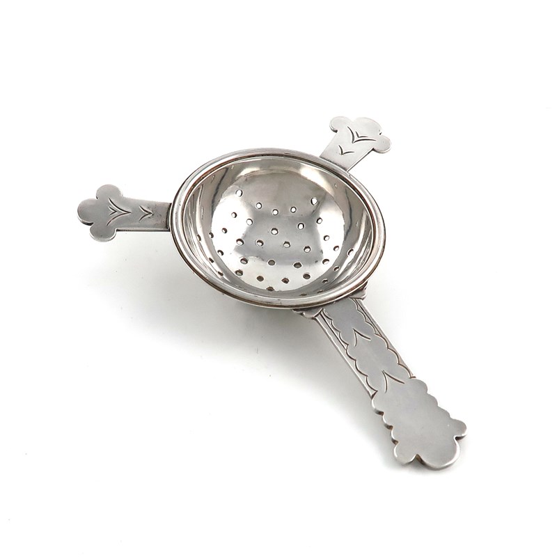 the circular bowl with two Trefid supports, the shaped handle with engraved decoration, length 1.5cm, approx. weight 2oz.