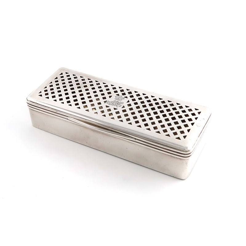 rectangular form, the hinged cover with pierced trellis decoration and with crowned initials, gilded interior, length 15.3cm, approx. weight 12.5oz.
