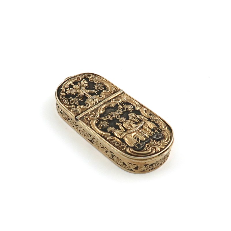 oblong form, foliate scroll decoration to the sides and base, the hinged covers with chased foliate scroll decoration around the depiction of three men at a table drinking and smoking, one cover of one compartment wood-lined, length 8.8cm, approx. weight 3oz.