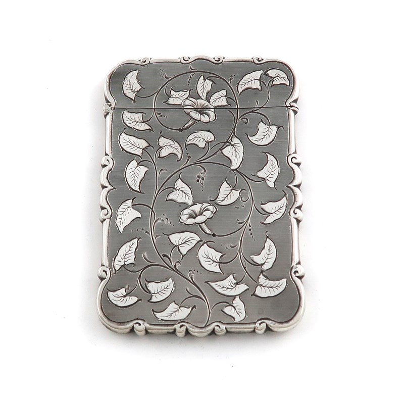 rectangular form with engraved ivy decoration on a reeded background, with a vacant cartouche, in a fitted case, length 10cm, approx. weight 2.1oz.