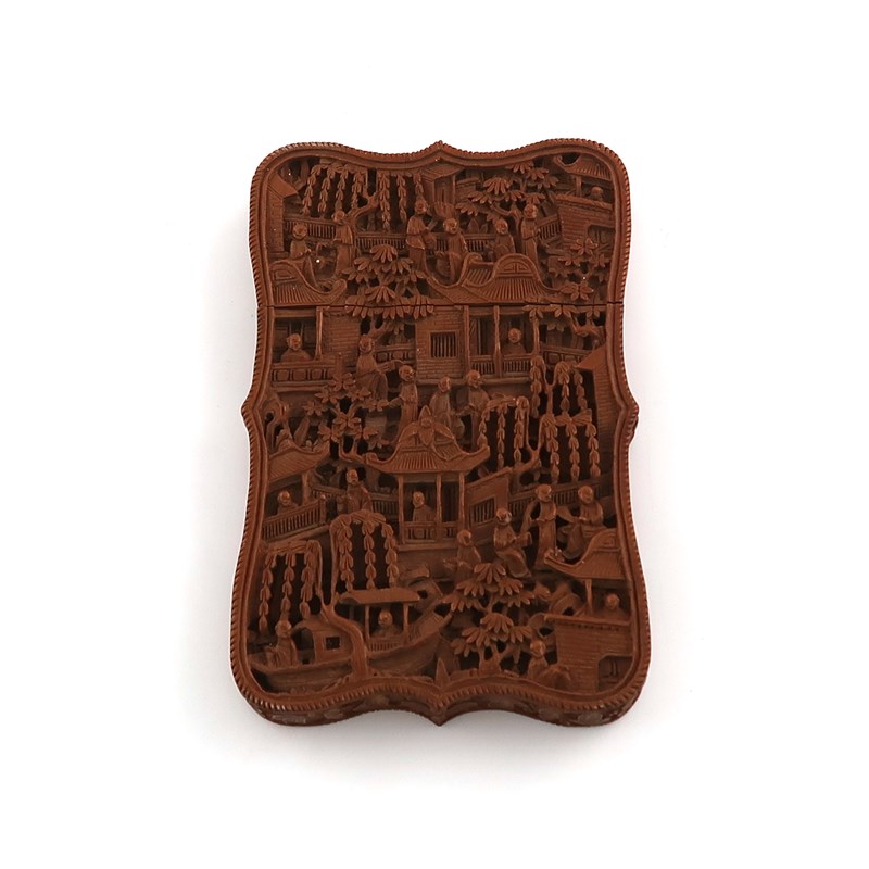 rectangular form, carved with figural scenes with buildings and foliate decoration, pull-off cover, length 11.4cm.