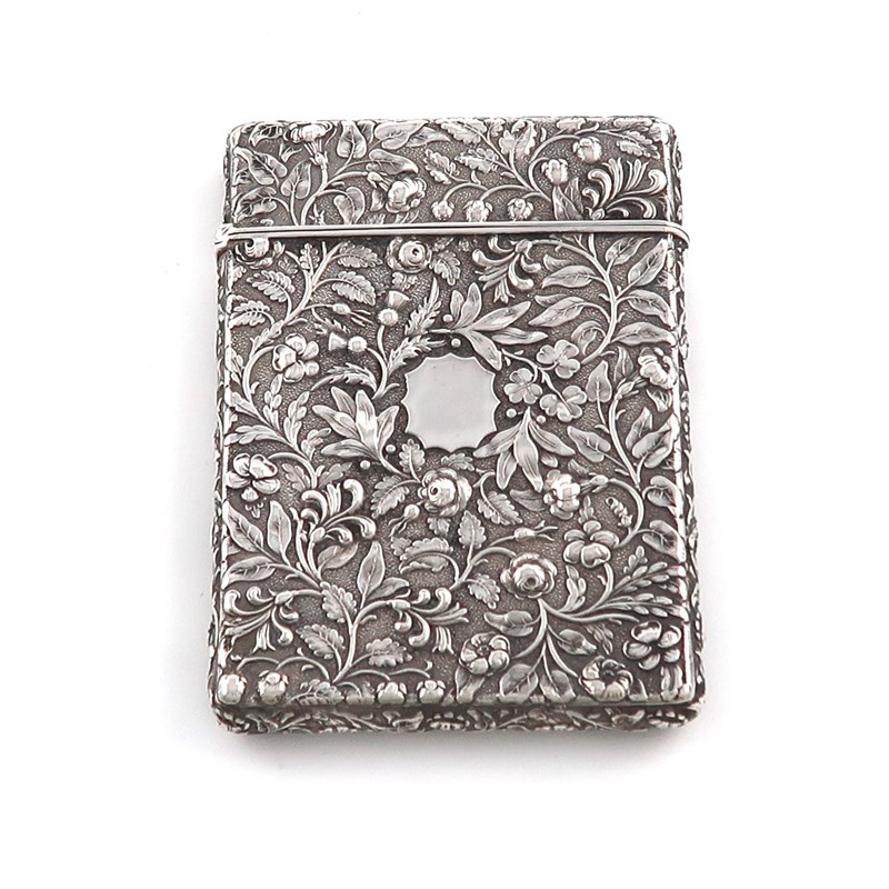 rectangular form, decorated with roses, thistles and other flowers on a matted background, the front with a vacant cartouche, length 9.7cm, approx. weight 2.7oz.