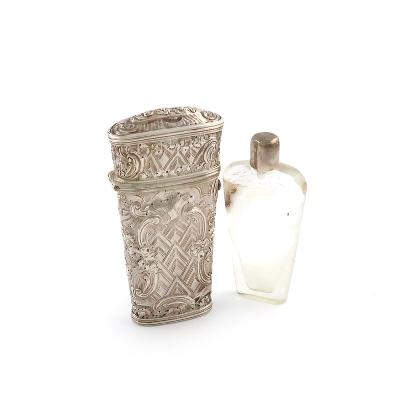 tapering oblong form, chased foliate scroll decoration around overlaid lozenges, the front with a push button clasp, hinged cover, the interior with a base metal mounted glass scent bottle, lined with blue velvet, length 9.5cm, approx. weighable 1.4oz.