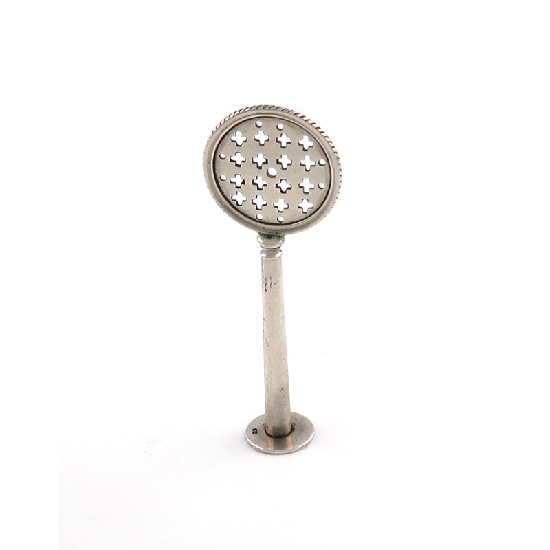 circular handle pierced with mullets, rope-work border, the screw-off sheath opens to reveal a steel spike, the circular terminal with initials, length 8.3cm.