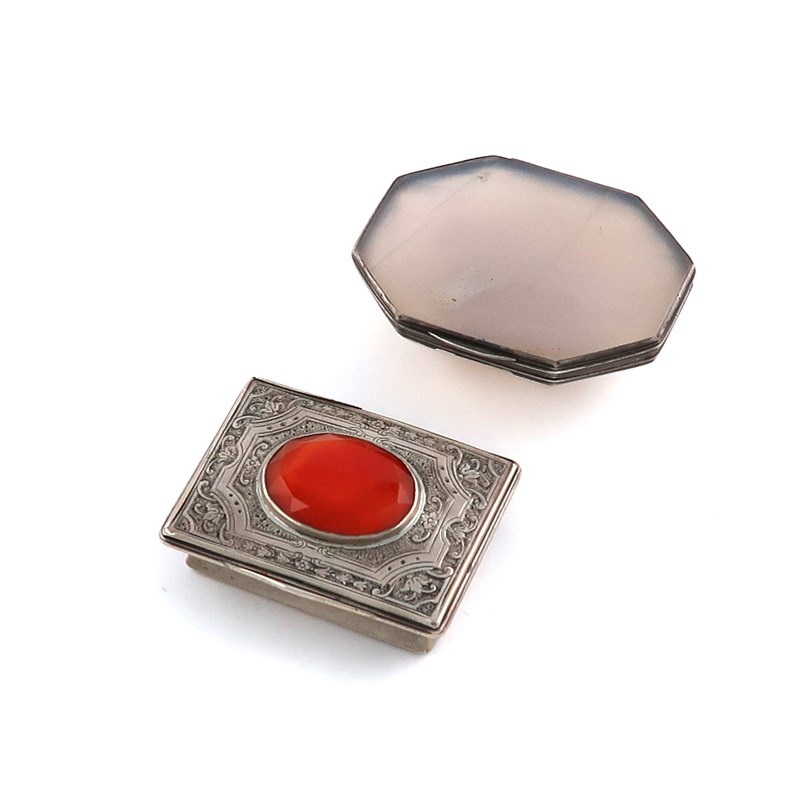rectangular form, chased decoration the hinged cover set with an orange hardstone cabochon, length 4.8cm, plus an early 18th century silver-mounted agate snuff box, rectangular form, canted corners, length 5.5cm. (2)