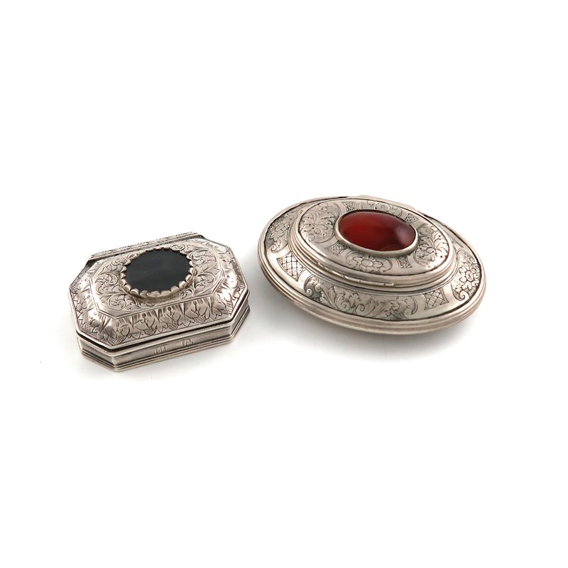 rectangular form, canted corners, engraved foliate scroll decoration, the hinged cover applied with a glass roundel, length 5.3cm, plus an early 18th century silver-mounted agate snuff box, circa 1730, oval form, the hinged cover set with an orange hardstone cabochon, the underside initialled 'M.W', length 7.2cm, approx. total weight 2.6oz. (2)