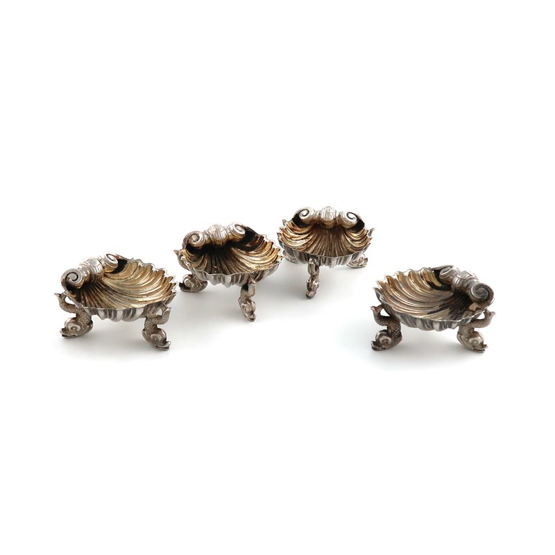 gilded bowls, on three mythical dolphin feet, length 6.3cm, approx. weight 4.4oz. (4)