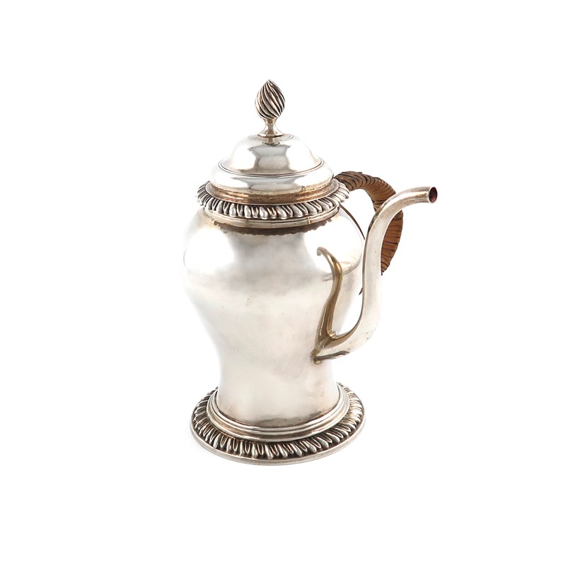 baluster form, wicker-bound scroll handle, the body with a hinged cover to the water compartment, pull-off cover with a gadroon border and flame finial, on a raised circular gadrooned foot, height 15.5cm, approx. weight 11.4oz.