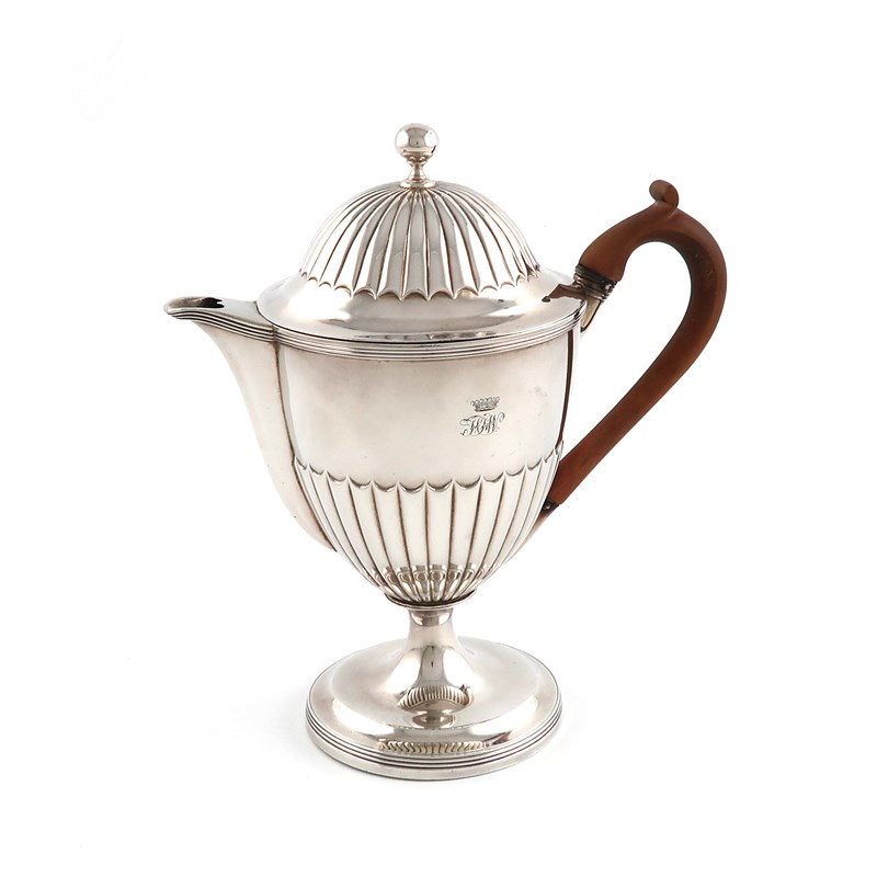 vase form, part-fluted decoration, scroll handle, raised pull-off cover with a ball finial, the interior with a cylindrical old Sheffield plate heating compartment with a pull-off cover, on a raised circular foot, engraved with a crowned monogram, height 19.7cm, approx. weighable 13oz.