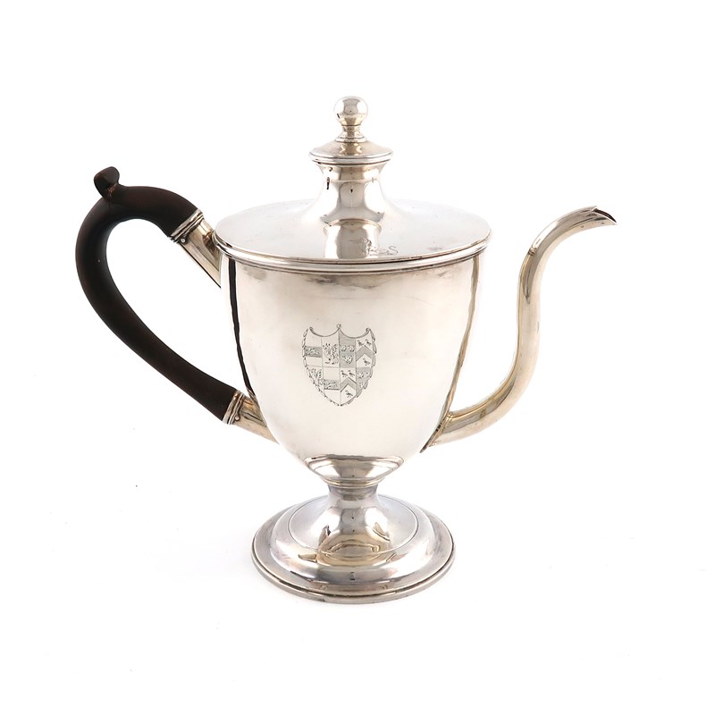 plain vase form, scroll handle, raised pull-off cover with a ball finial, the interior with a tapering heating compartment with a pull-off cover, on a raised circular foot, engraved with an armorial shield and crest, height 17cm, approx. weight 13.8oz.