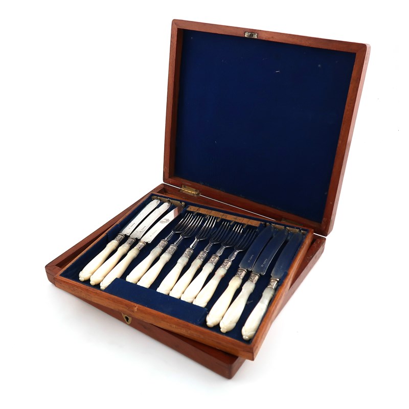 carved mother-of-pearl handles, in a fitted wooden case. (22)