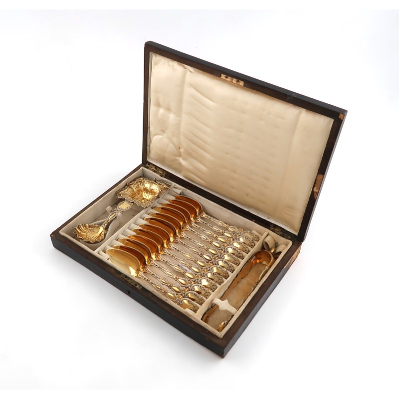A set of twelve French parcel-gilt silver teaspoons with a pair of sugar tongs, tea caddy spoon and