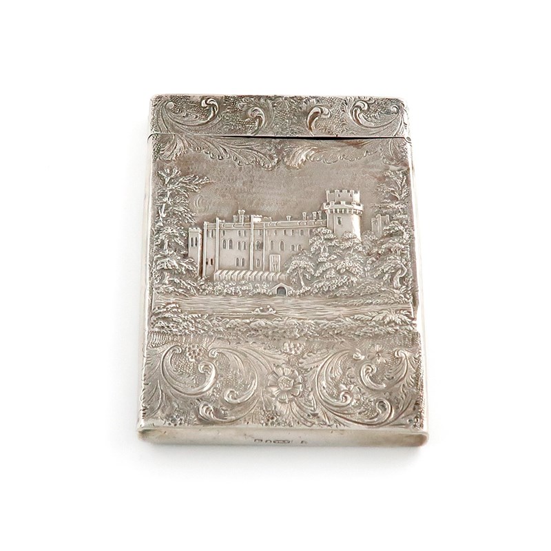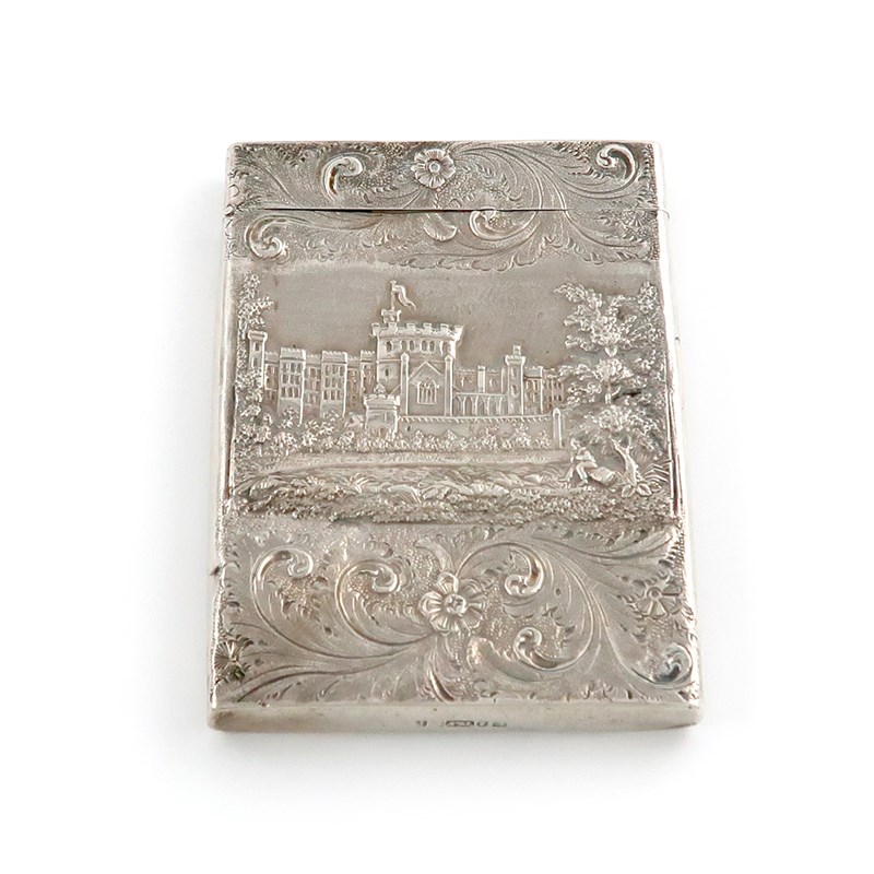 rectangular form, the front with a scene of Windsor Castle, the reverse with a scene of Warwick Castle, within chased foliate scroll decoration, length 9.5cm, approx. weight 2.4oz.