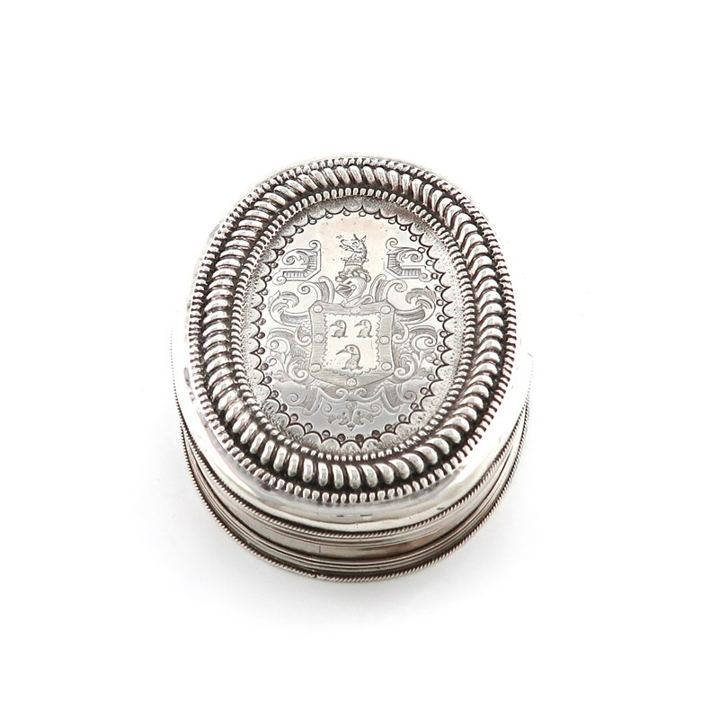 oval form, the pull-off cover with an armorial within rope-work and bead borders, length 9.4cm, approx. weight 4.3oz.