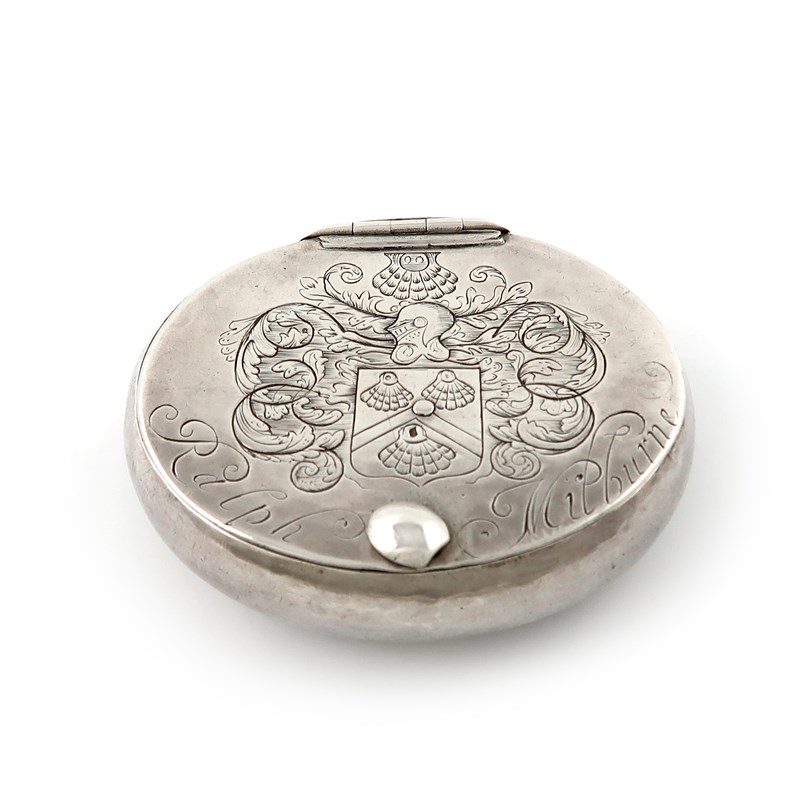 oval form, the hinged cover engraved with an armorial and crest, within foliate scroll mantling, and inscribed 'Ralph Milburne', slide-action button to cover, inside of cover with steel spring, length 8.4cm, approx. weight 3.6oz.