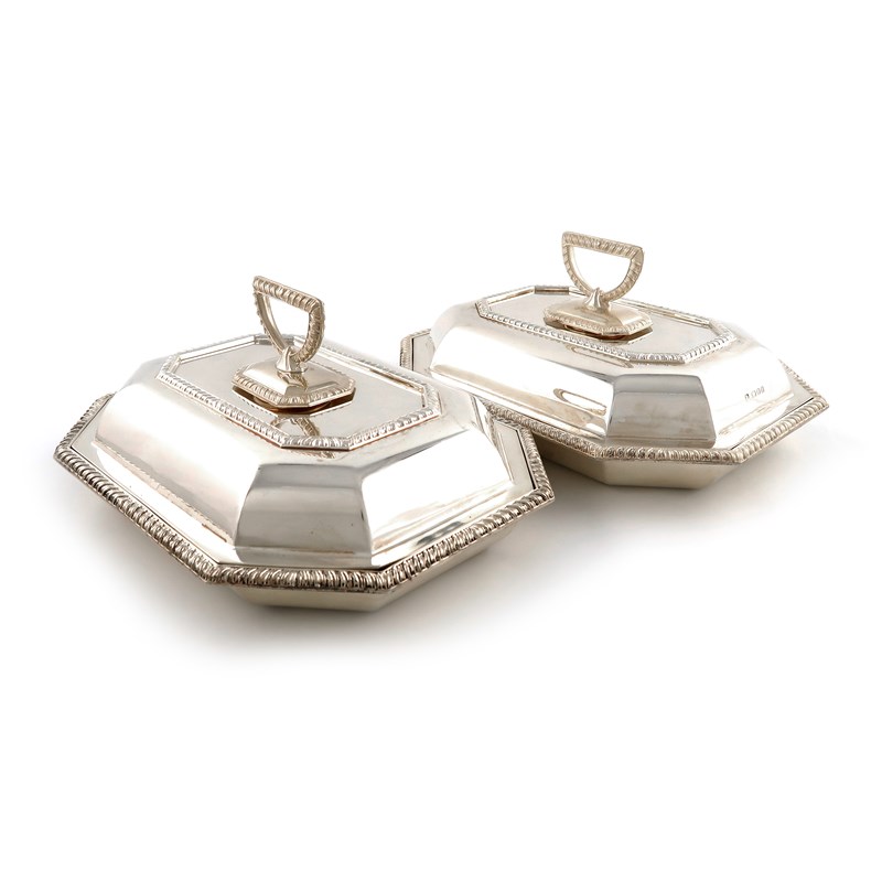 rectangular form, canted corners, gadroon borders, detachable handles, length 29.7cm, approx. weight 113oz. (2)