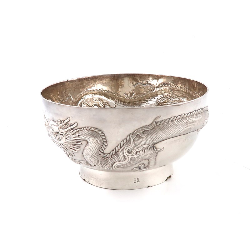 circular form, embossed with a large dragon, on a circular foot, diameter 18.5cm, approx. weight 19oz.
