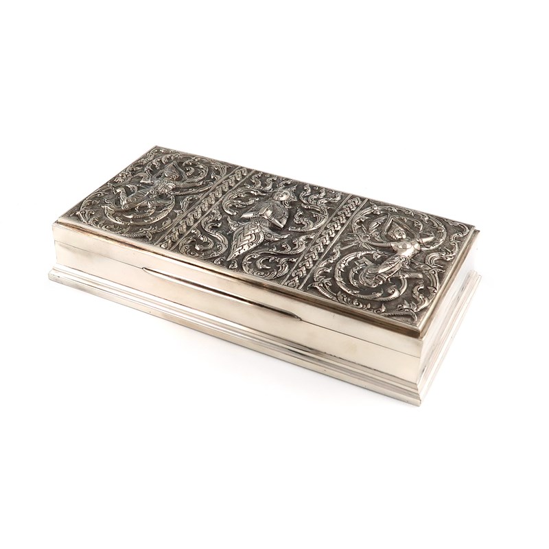 rectangular form, the hinged cover with three goddesses and foliate decoration, wood lined, length 21.1cm.