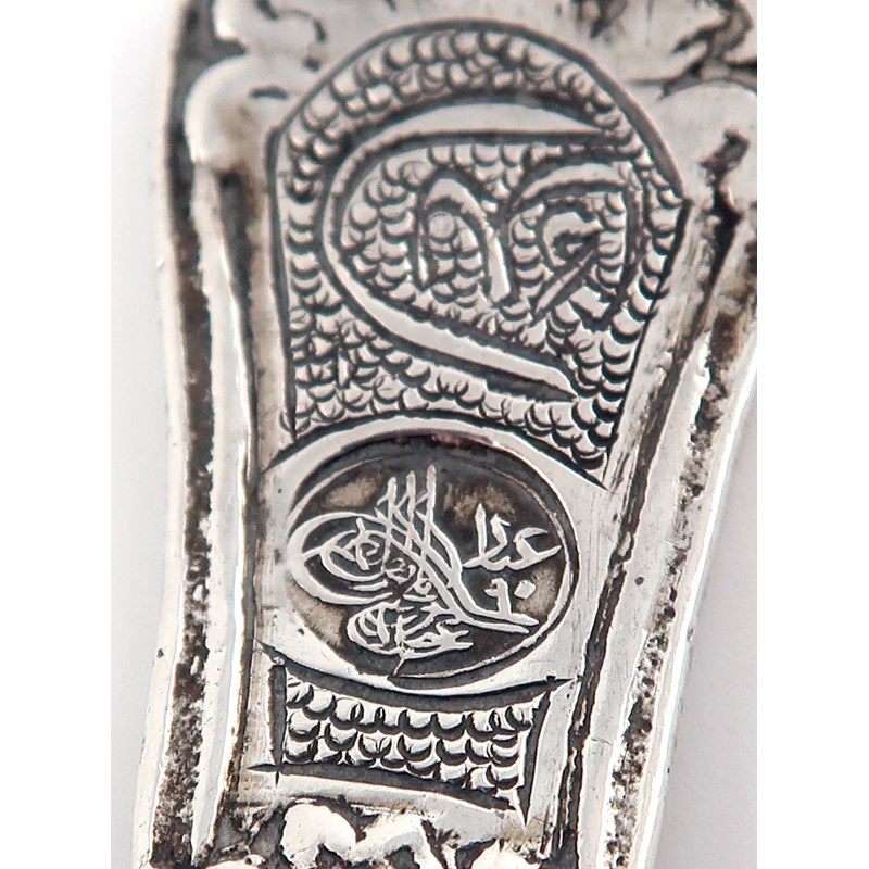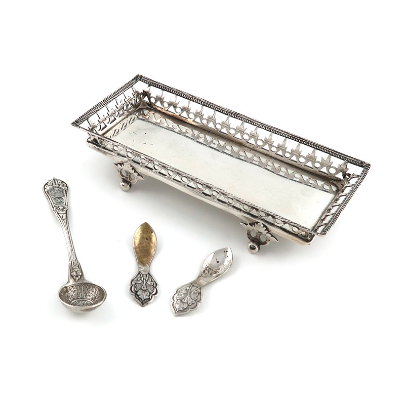 marked with an assay scape, rectangular form, pieced gallery and chevron border, on four pierced bracket feet, length 17.2cm, plus a Turkish silver spoon, the bowl with chased decoration, and two small metalware spoons, with foliate handles, approx. weighable 6oz. (4)