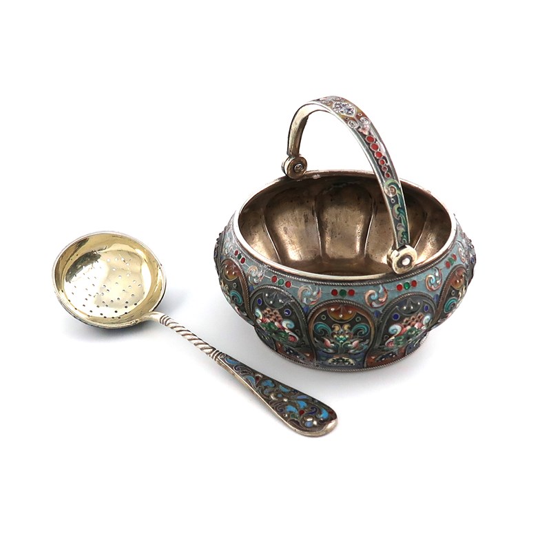 A Russian silver and enamel sugar bowl and matching spoon,