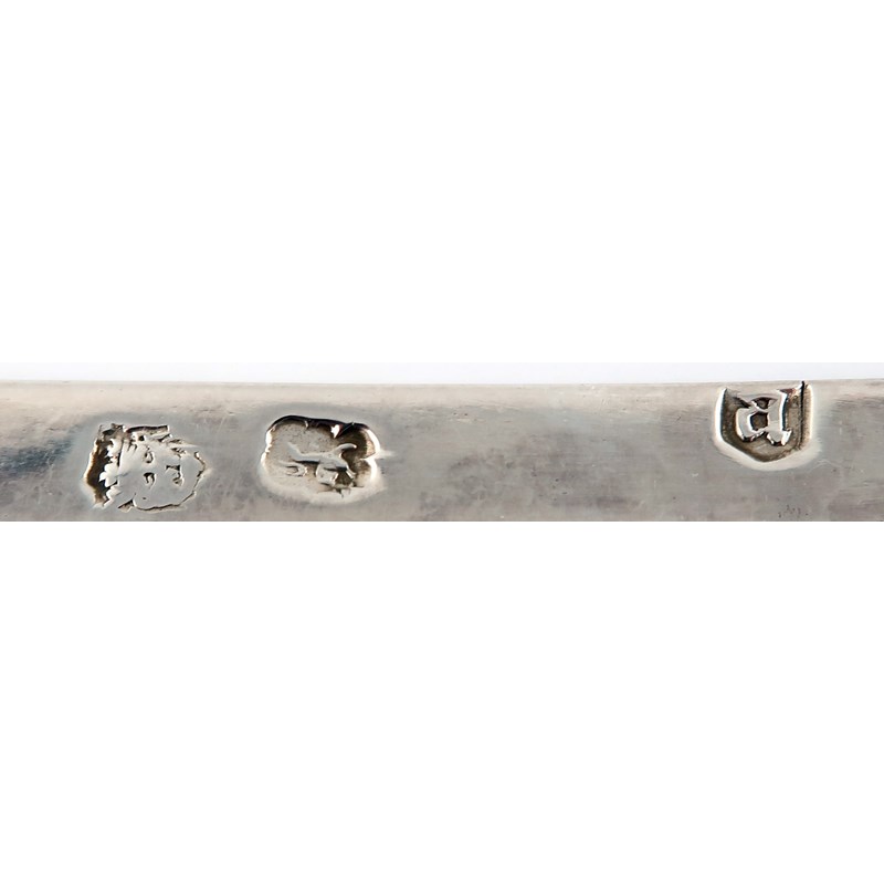 the reverse of the oval bowls with a raised rat-tail and scroll decoration, the front of the terminals with similar decoration, the reverse of the terminals with a crest, approx. weight 3.5oz. (2)
