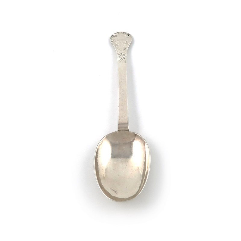the reverse of the bowl with a raised rat-tail and foliate scroll decoration, the terminal with scroll decoration, length 19.4cm, approx. weight 1.6oz.