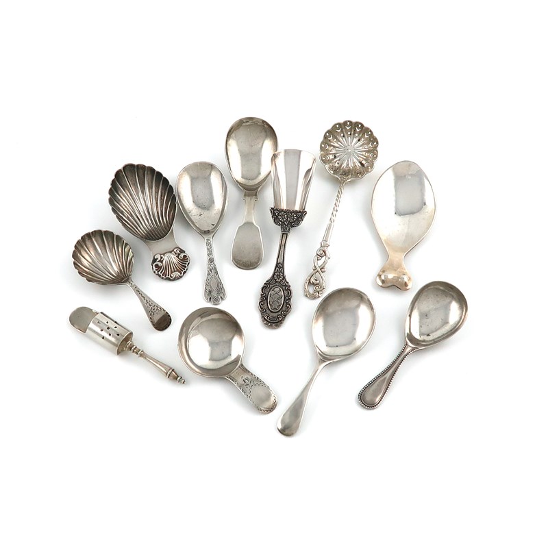 comprising silver items: one George III Fiddle pattern, Newcastle 1808, one George IV with shell formed bowl and Bright-cut decoration, by William Bateman, one George III with Bright-cut decoration, one Bead pattern, one Old English pattern, one with a shell formed bowl and shell thumbpiece, one modern Trefid pattern, one modelled as a stylised fish, plus a late-Victorian sugar sifting spoon, an Edwardian sugar sifting spoon, and a continental caddy spoon, total approx. weighable 5oz. (11)
