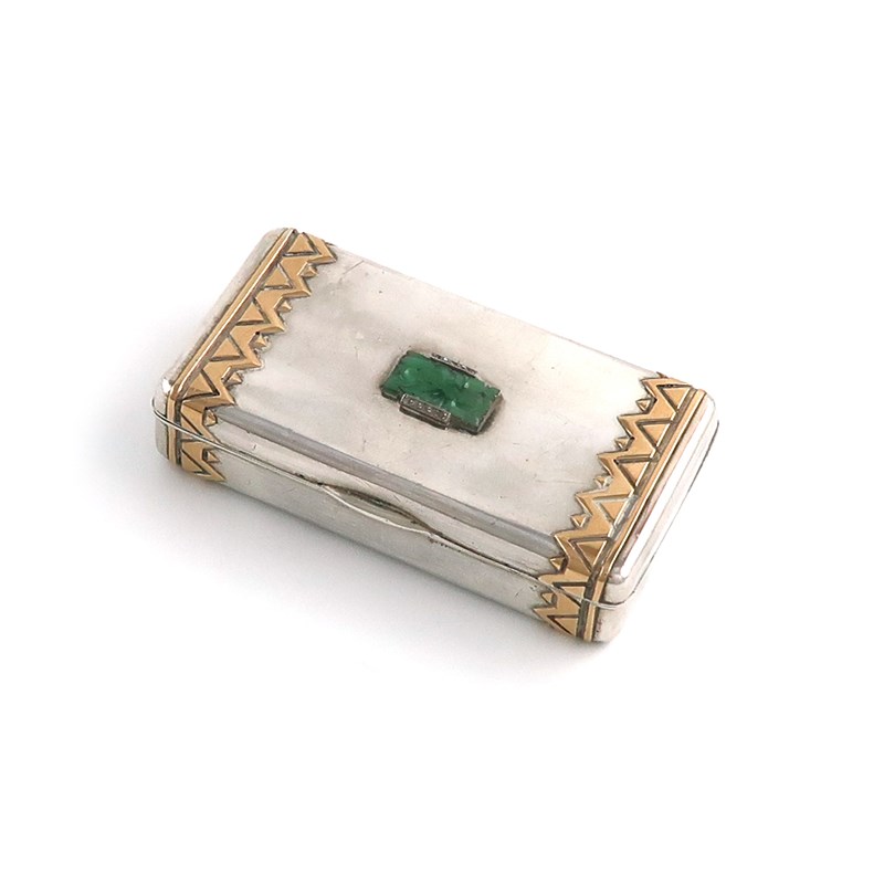 rectangular form, with two bands of gilded zigzag decoration, the hinged cover applied with a carved green hardstone cabochon with gem mounts, only two stones remaining, plain thumb-piece, length 7.4cm, approx. weight 2.5oz.