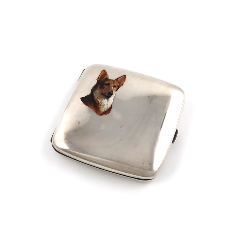 rectangular form, the cover enamelled with a dog's head, length 8.3cm, approx. weight 3.7oz.