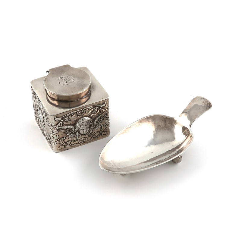 square form, embossed angel decoration, the hinged cover initialled, plus an A. E. Jones spoon dish, over-stamped with maker's mark of George Payne and Son, Birmingham 1927, oval bowl, spot-hammered decoration, approx. weighable 2.7oz. (2)