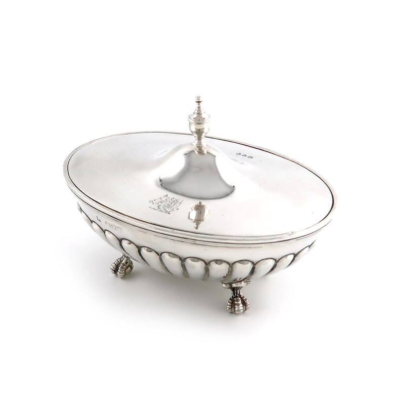 oval form, part-fluted, the domed pull-off cover with a crest and an urn-shaped finial, on four ball and claw feet with trefoil shoulders, length 16cm, approx. weight 12.5oz.