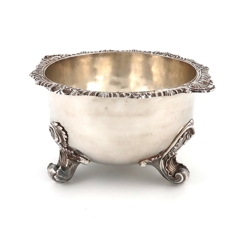 circular form, gadroon and shell rim, on three foliate scroll feet, diameter 18.6cm, approx. weight 18.8oz.