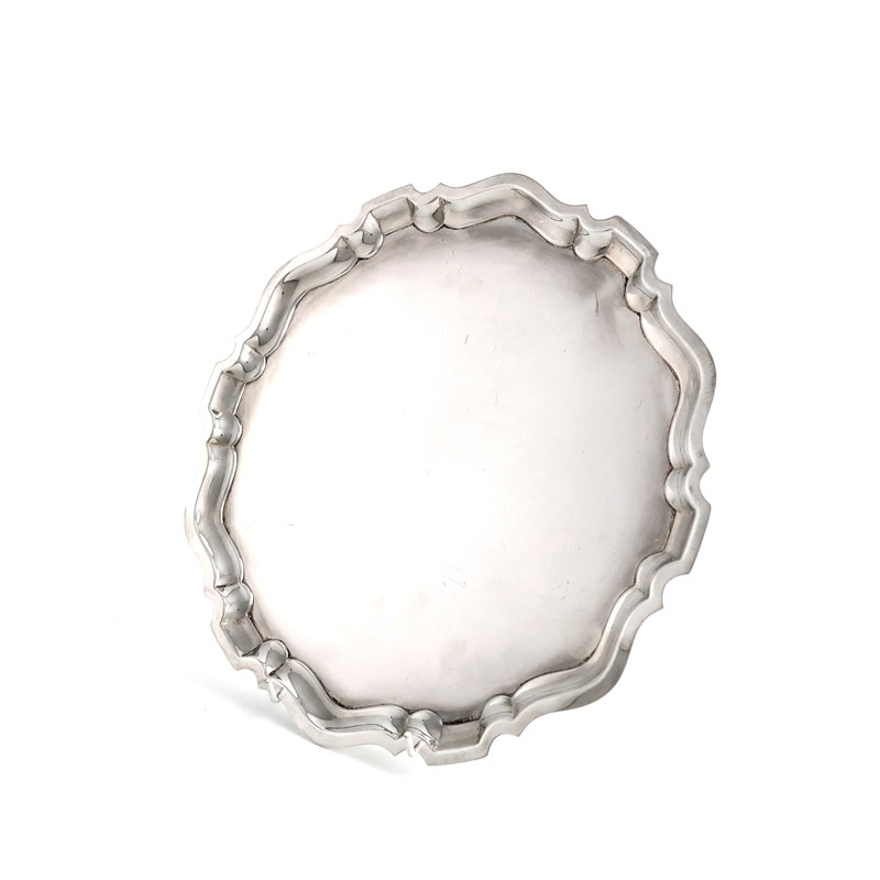 circular form, moulded border, on three bracket feet, diameter 28.6cm, approx. weight 19oz.