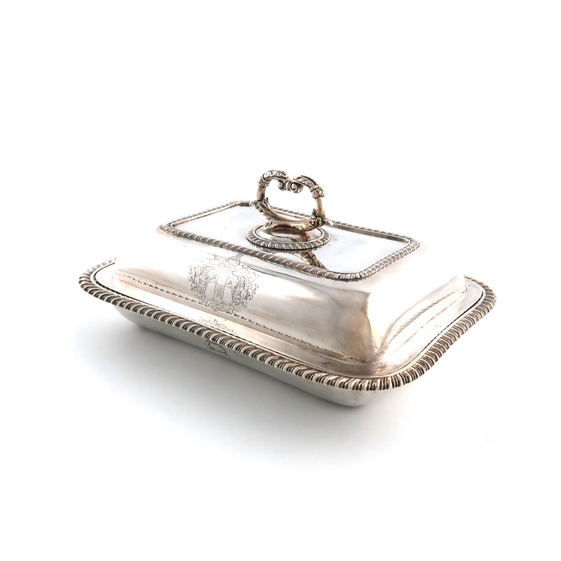 rectangular form, gadroon borders, the pull-off cover with a detachable gadroon handle, the cover with an armorial, the base with a crest, numbered '1' and '2', length 29cm, approx. weight 58.5oz.