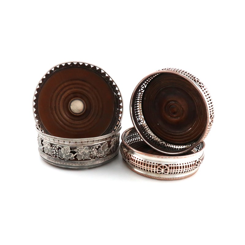 circular form, pierced and chased with trailing grapevines and bunches of grapes, pierced border, the turned wooden bases with unmarked central buttons, diameter 15cm, height 5.8cm, plus a pair of electroplated wine coasters, of circular form, pierced with vertical slats, wooden bases. (4)