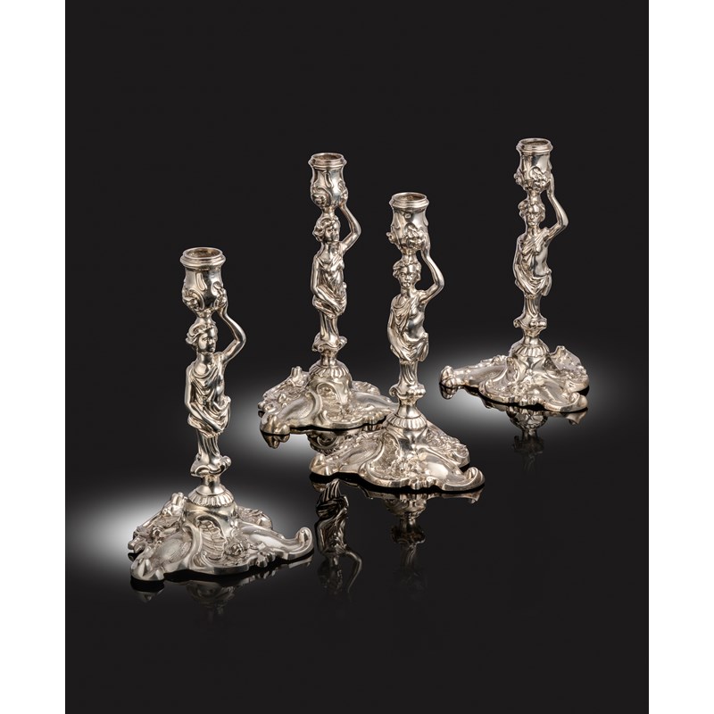 caryatid form, urn shaped capitals with foliate decoration, on triangular bases with foliate scroll decoration, and engraved with an armorial, height 24.7cm, approx. weight 95oz. (4)