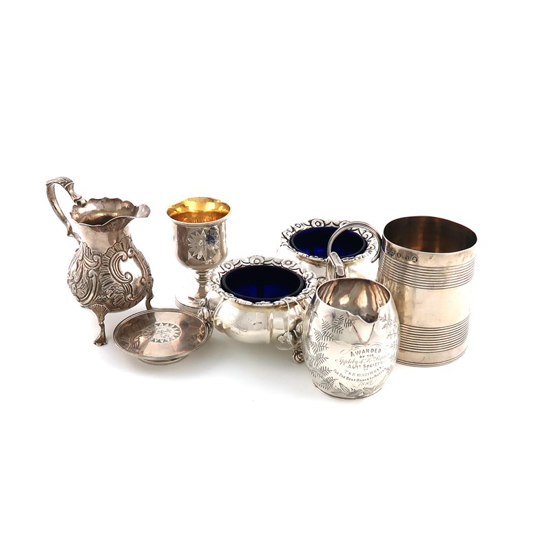 comprising: a George III mug, by George Smith, London 1791, tapering circular form, reeded bands, initialled, a pair of Victorian salt cellars, by Henry Holland, shaped circular form, engraved with a crest, foliate borders, on three foliate-capped rose bud feet, blue glass liners, a travelling chalice and paten, by Charles Reily & George Storer, London 1833, a George II cream jug of baluster form, plus a Victorian cream jug engraved with ferns and presentation inscription 'Awarded by the Applby & Ky.Stephen Agrl. Society to T & E Whitwell for the Best Basket of Butter 1882', approx. weight 13.7oz. (7)