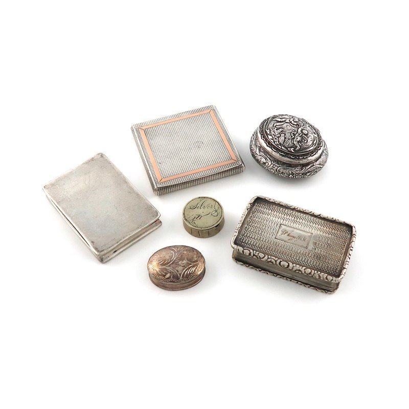 various dates and makers, including a William IV snuff box, by Thomas Shaw, Birmingham 1834, rectangular form, engine-turned decoration, plus a compact, an oval box with import marks for London 1891, and two other boxes, plus a base metal box of circular form, engraved 'Gold' and 'Silver', approx. weighable 10oz. (6)
