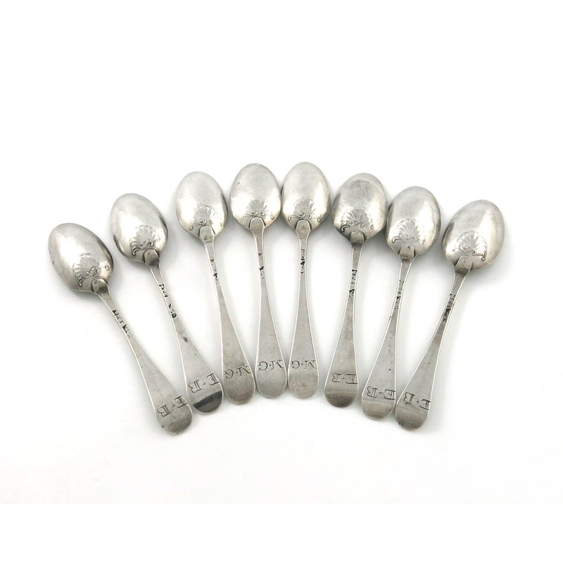 A matched set of eight George II silver Hanoverian pattern teaspoons