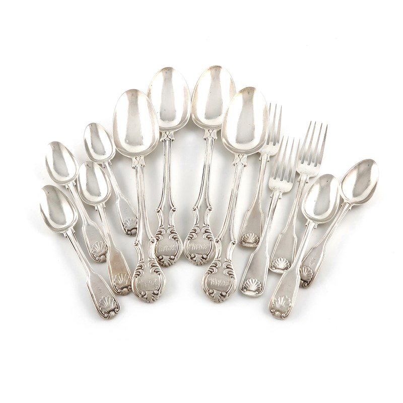 comprising: a set of four Victorian pattern tablespoons, by Hayne and Cater, London 1840, plus three single-struck Fiddle and Thread dessert forks, Exeter, and six Fiddle, Thread and Shell pattern teaspoons, approx. weight 24oz. (13)