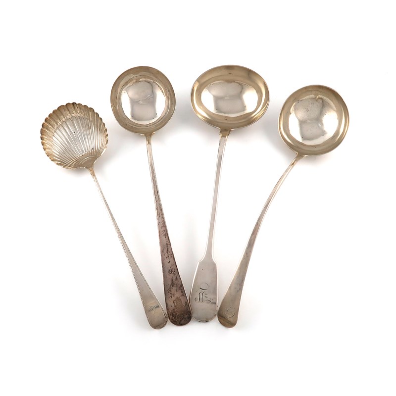 comprising: a George III Old English pattern one, by Hester Bateman, London 1783, another Old English pattern one, London 1791, a Feather-edge pattern one, London 1773 and a Fiddle pattern one, London 1827, approx. weight 18oz. (4)