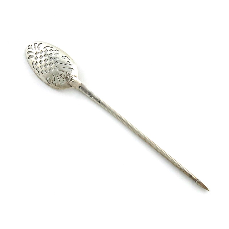 the reverse of the bowl with a foliate motif, the stem with textured decoration, the bowl pierced with mullets and scrolls, length 13.2cm, approx. weight 0.2oz.