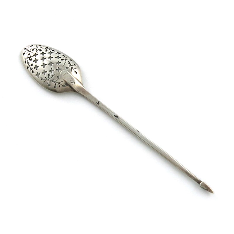 the oval bowl pierced with mullets and foliate decoration, the stem scratch initialled 'S', length 13.3cm, approx. weight 0.3oz.