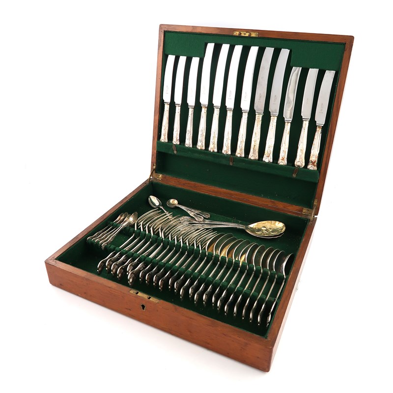 comprising: six table forks, six dessert forks, six dessert spoons, six soup spoons, six teaspoons, six table knives, six dessert knives, and four electroplated items, in a fitted case, approx. weighable 55oz.