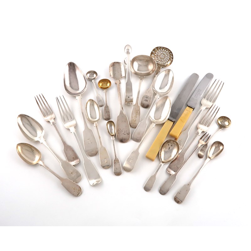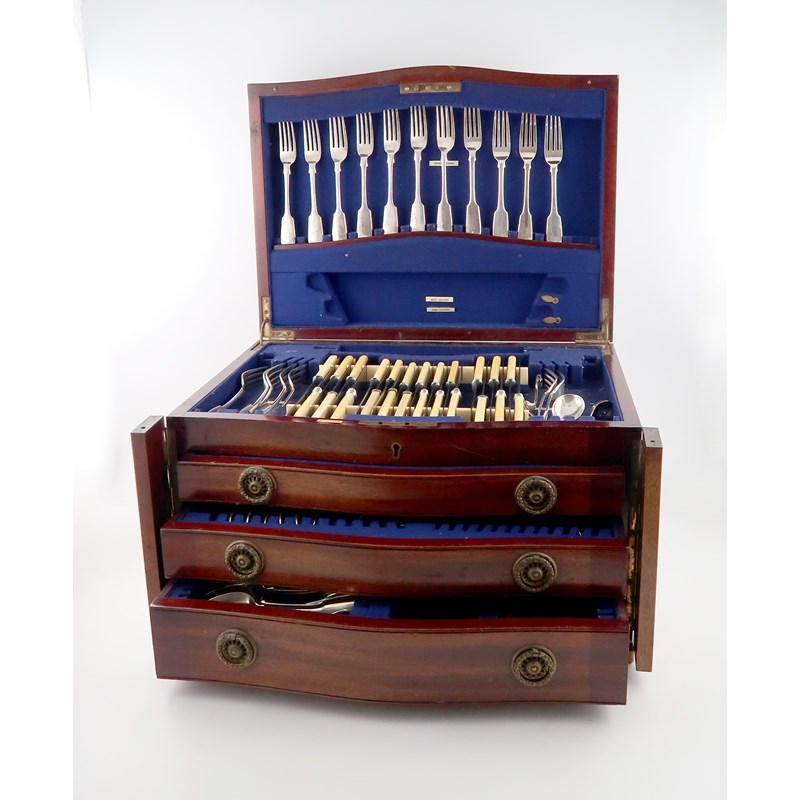 comprising: thirteen table forks, twelve tablespoons, twenty-three dessert forks, thirty-one dessert spoons, thirty-one teaspoons, four sauce ladles, a sugar sifting spoon, a caddy spoon, a two pairs of sugar tongs, six salt spoons, two mustard spoons, a stilton scoop, and a pickle fork, plus various ivory handled knives, in a fitted three drawer wooden case with inlay, approx. weighable 160oz. (qty)