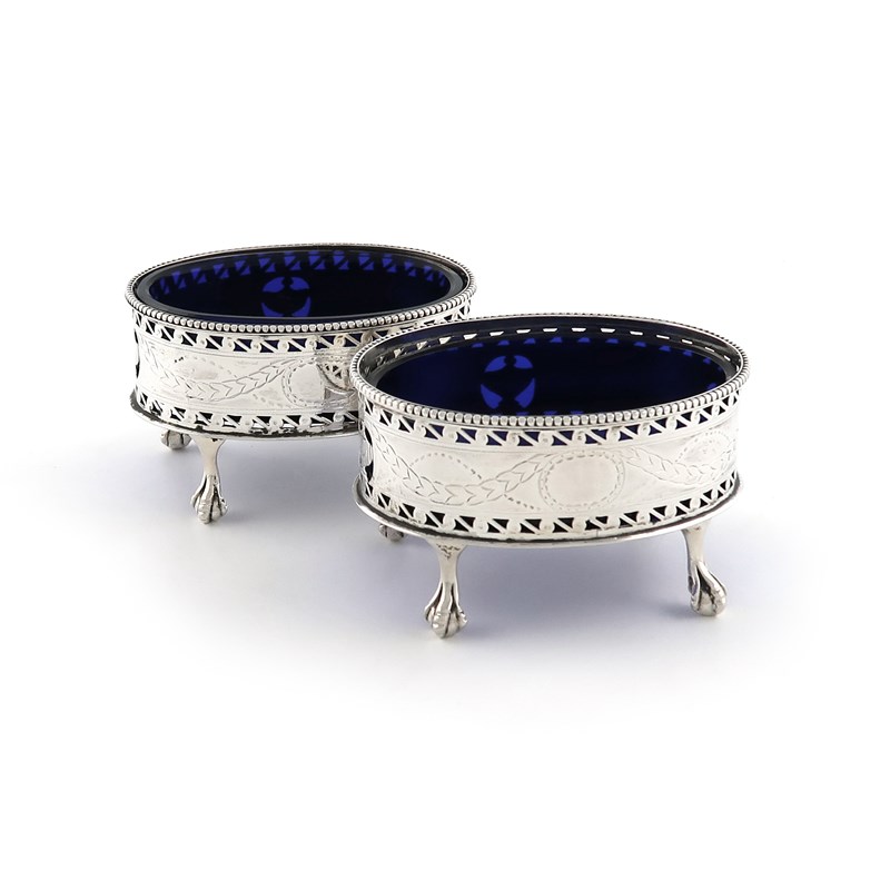 oval form, engraved and pierced foliate decoration with urns, beaded borders, on four claw and ball feet, with blue glass liners, approx. weight 3.6oz. (2)