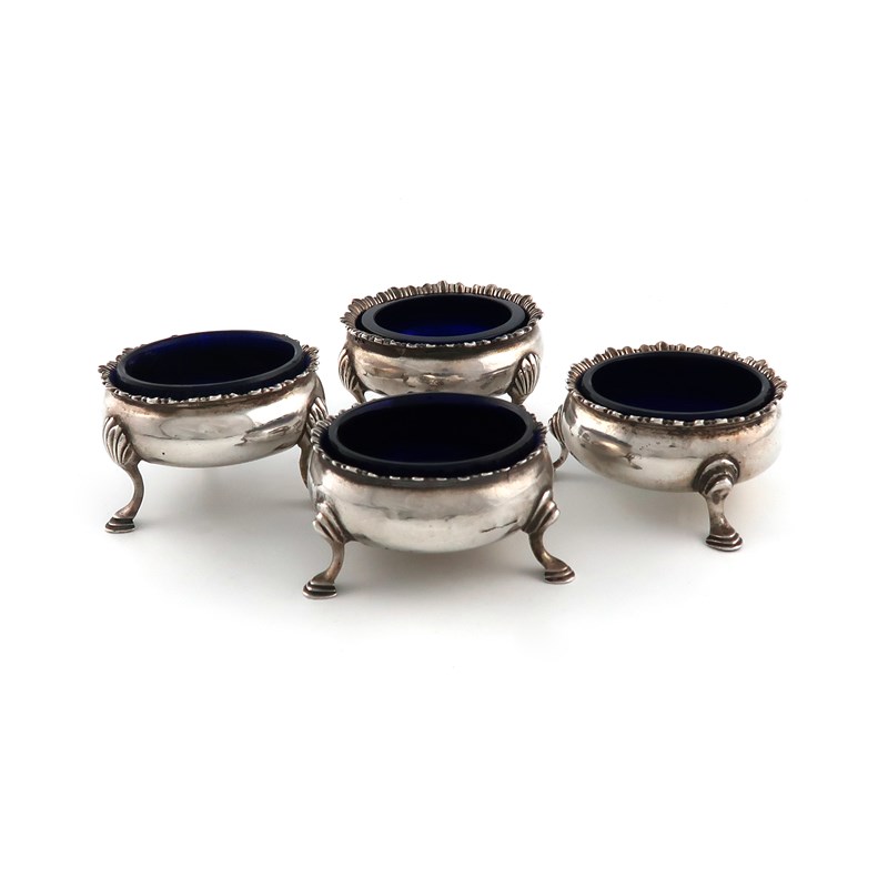 cauldron form, gadroon border, on three hoof feet, plus a similar pair of George III silver salt cellars, by Thomas Shepherd, London 1777, approx. weight 5.5oz. (4)