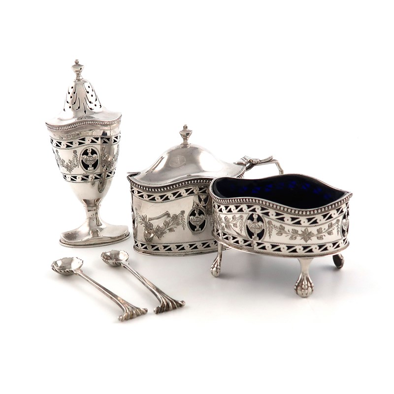 oval form, pierced and engraved foliate decoration and with urns, with blue glass liners and with a salt spoon and later mustard spoon, approx. weight 7.5oz. (5)