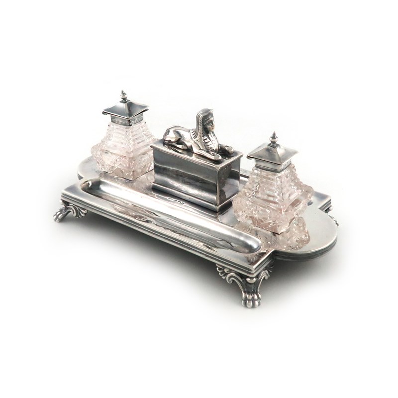 shaped rectangular form, with two pen wells, with a central box with a pull-off cover with a sphinx, on four paw feet, with two silver-mounted cut glass inkwells, by Henry Manton, Birmingham 1896, length 26.5cm, approx. weighable 21oz.