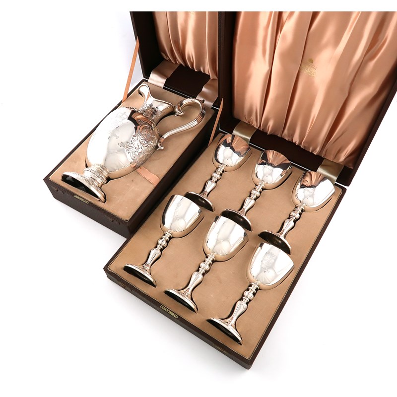 the ewer of ovoid form, engraved foliate decoration and with the Royal Ciphers and 'Silver Wedding', scroll handle, on a raised circular foot, the goblets with tapering circular bowls, gilded interiors, with similar engraving, on a baluster stem on raised circular foot, in two fitted cases, height of ewer 29cm, height of goblets 15.1cm, approx. weight 67.5oz. (7)